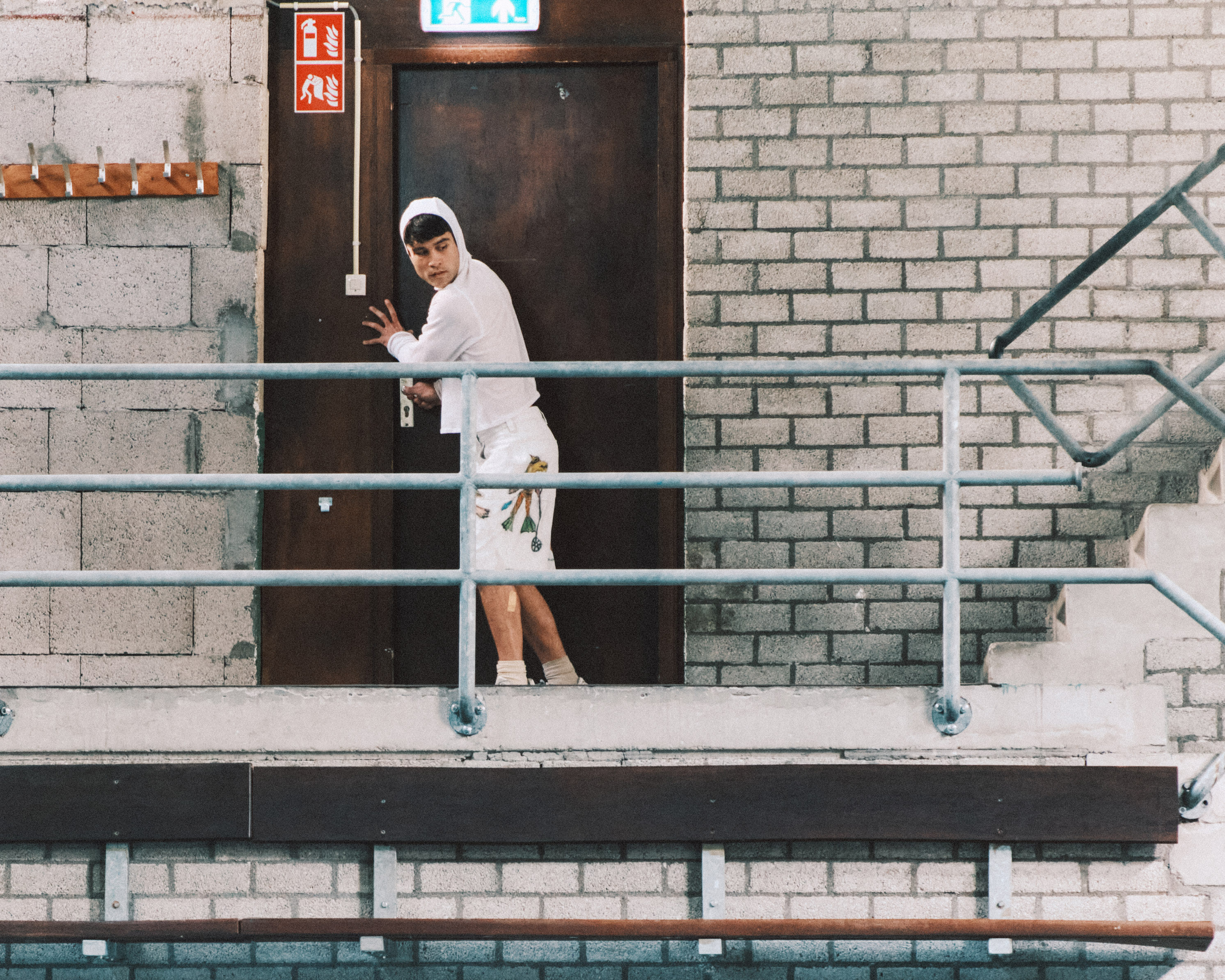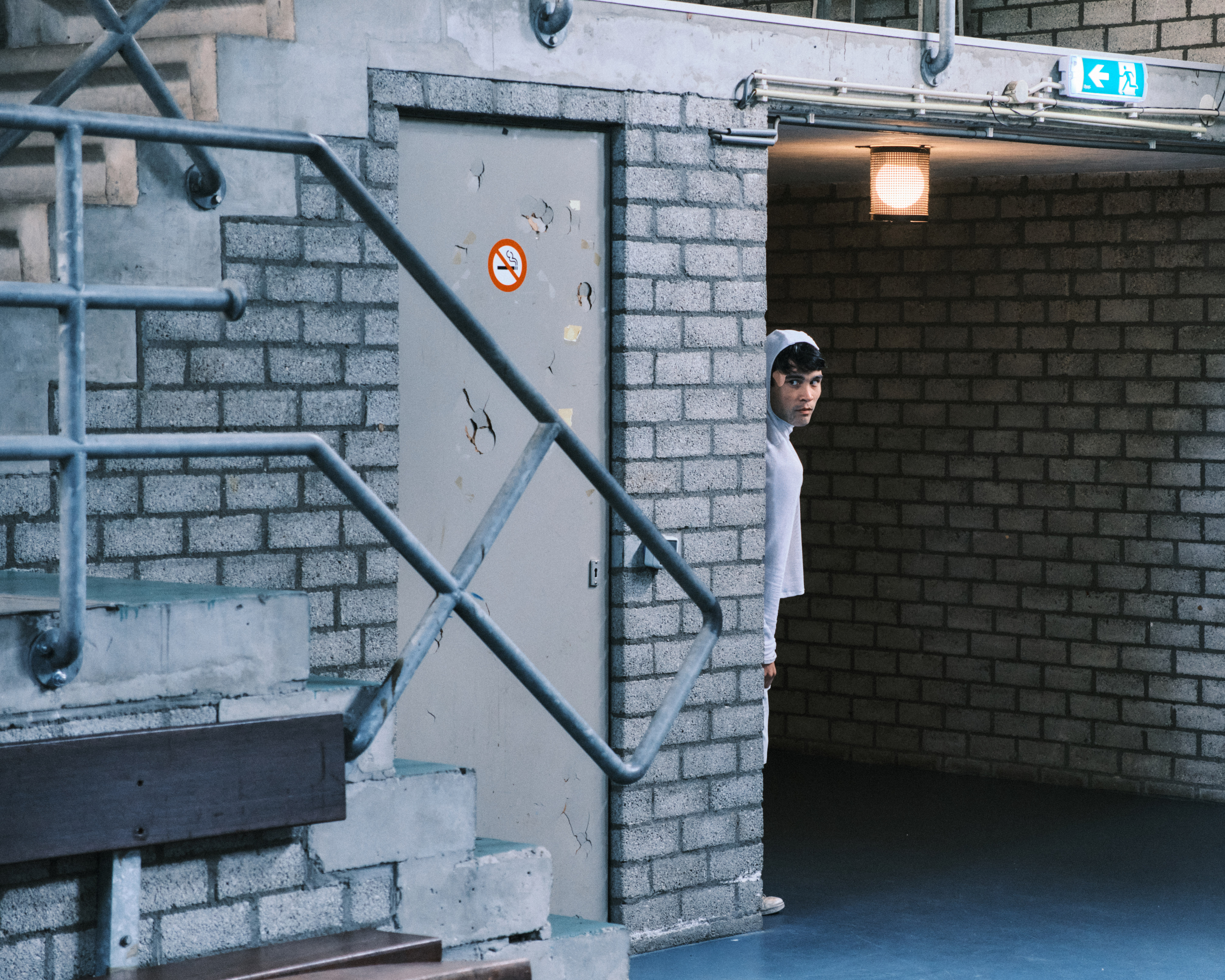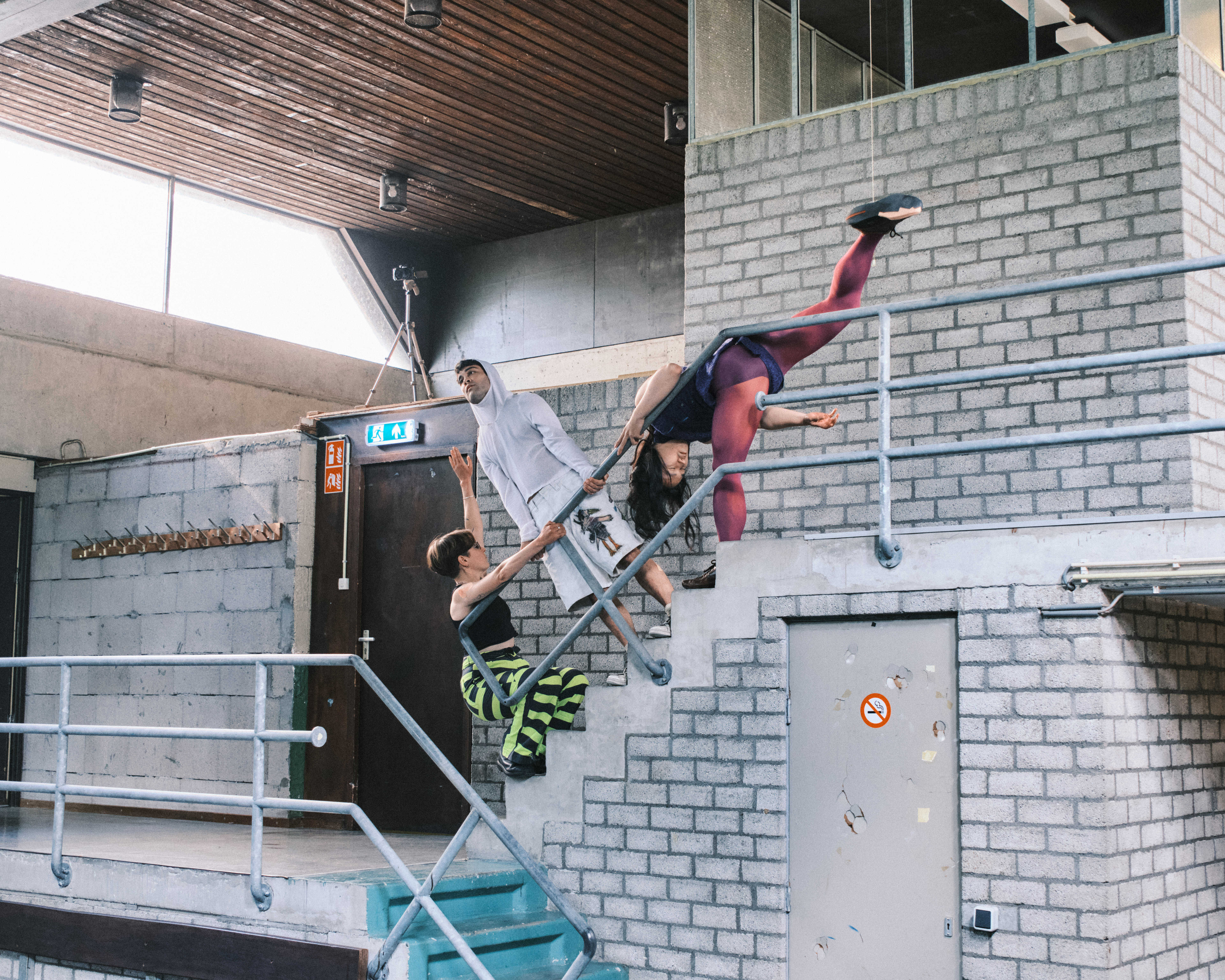 Deposition 2 is a performance by Ivan Cheng, Jules Reidy, Marcus Whale, with garments by Good & Bad (Marina M. Kolushova, Victor Stuhlmann, Ossi Lehtonen) and camera by Arvo Leo & Max Grund, staged for the spaces of the gymnasium of the structuralist complex Gouden Leeuw. The piece is presented by GDL525 in the context of Ivan Cheng’s residency at the Mondriaan Initiative in Laren. Written during a brief working period together at the residency, it continues their various collaborations over the last decade